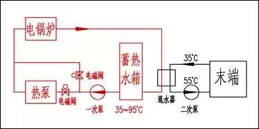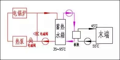 在晚間谷電價的時間段中,空氣源熱泵機組把蓄熱水箱的水溫從35℃提升到50℃,電鍋爐再把水溫提升到95℃。