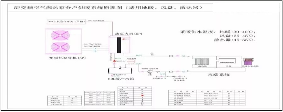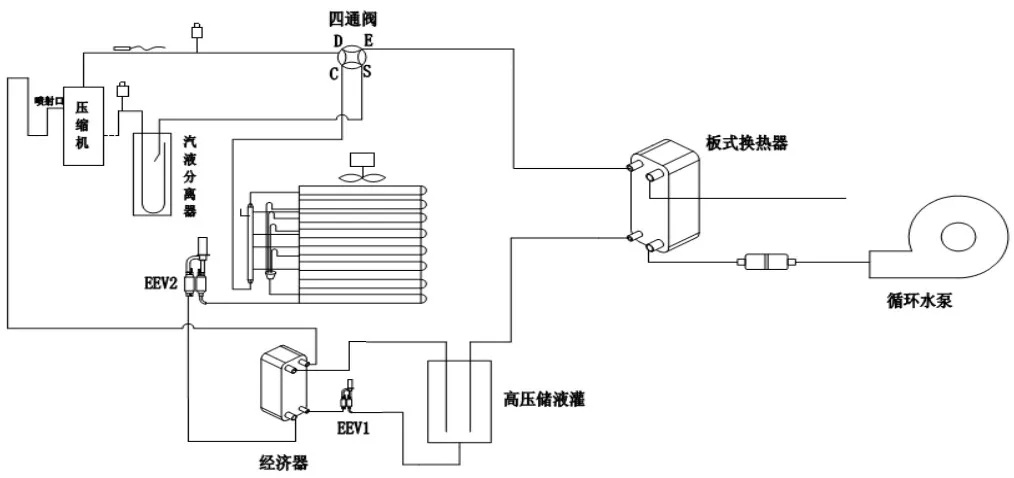 由上表可知北京延慶地區120平方米的農村居民常用戶型采暖所需熱負荷約為7.5KW,室外環境溫度為-12℃時,其制熱量約為8.65KWd的EVI變頻變水溫機組,額定制熱輸入功率為3.73KW,冬季可在-25℃的環境中正常供暖,確保山區農戶冬季采暖需求。系統原理圖:
