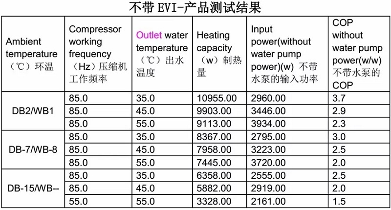 1)EVI對COP的影響:45度以下,水溫不高時,不帶EVI產品的COP比帶EVI產品的高,但水溫到55度時,情況就反過來,帶EVI產品的COP明顯高不帶EVI產品的,大約高20%;