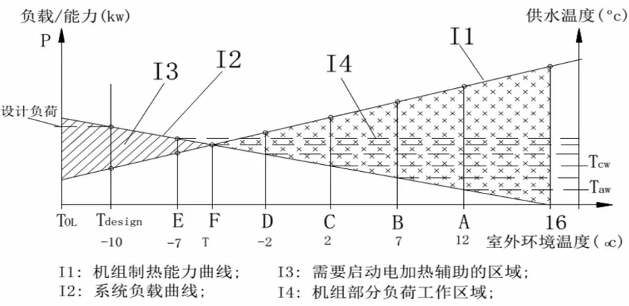 在熱泵供暖系統里面,調節供水溫度是最有效率的控制方式,如上節中所舉的臺機器的試驗參數所顯示的,供水溫度對熱泵的COP有明顯影響,供水溫度越高,COP越低,從上面的數據看,溫度每升高1度,COP下降約2%;下圖,是空氣源熱泵制熱能力和建筑物所需負載在不同環溫下,對比變化的一對交叉曲線,在80%以上的時間,機組工作在部分負荷狀態,變頻變水溫機組,在如下幾個因素上,能大幅提高機器的綜和季節能效比SCOP: