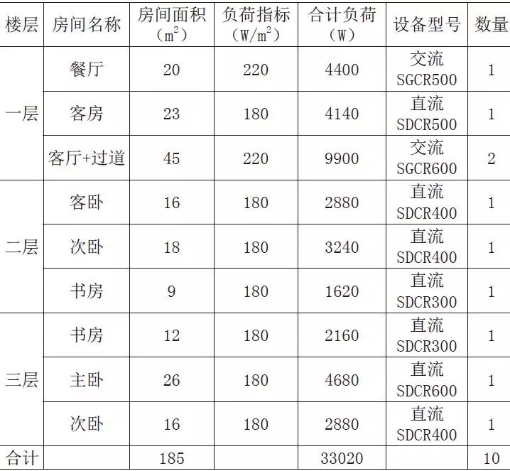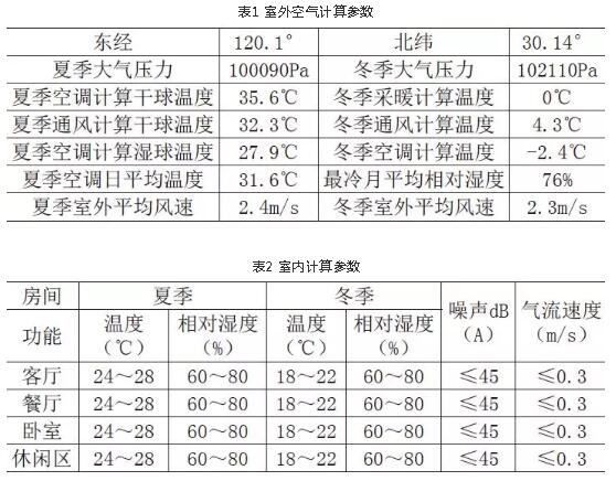冷負荷由人體、燈光、設備、食物等冷負荷和外圍護結構(外墻、外窗和外門)及內圍護結構(內墻、內窗、內門和樓板等)的得熱組成;經負荷計算及規范,參照本地的設計經驗,別墅建筑的空調冷負荷設計指標為180W/m2~220W/m2。