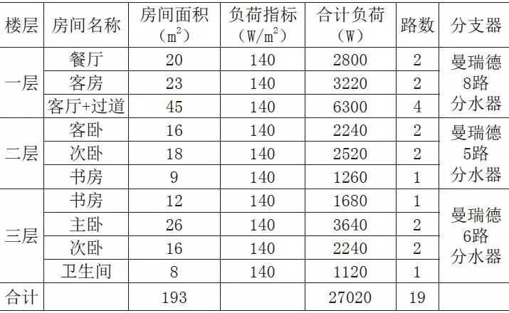 熱負荷由外圍護結構和內圍護結構的基本耗熱量及其附加耗熱量和冷空氣滲透耗熱量組成;冬季供暖的室內設計溫度設為20℃,經負荷計算及規范,參照本地經驗,別墅建筑的供暖熱負荷設計指標為140W/m2,符合要求。