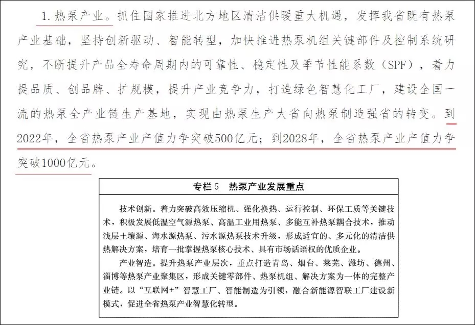 9月,山東省人民政府發布《山東省新能源產業發展規劃(2018-2028年)》,指出熱泵、太陽能、風電、生物質能是山東省具有良好優勢的新能源產業。在熱泵產業方面,抓住國家推進北方地區清潔供暖重大機遇,建設全國一流的熱泵全產業鏈生產基地,實現由熱泵生產大省向熱泵制造強省的轉變。到2022年,山東省熱泵產業產值力爭突破500億元;到2028年,山東省熱泵產業產值力爭突破1000億元。