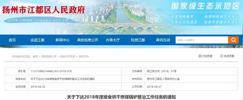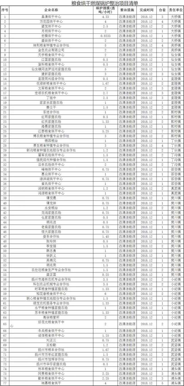2018年4月20日,揚(yáng)州市江都區(qū)人民政府辦公室下達(dá)了《關(guān)于2018年度糧食烘干燃煤鍋爐整治工作任務(wù)的通知》,指出為全面整治高污染燃料糧食烘干爐,年底前完成全區(qū)糧食烘干燃煤鍋爐淘汰或?qū)嵤┣鍧嵞茉刺鎿Q(初步調(diào)查的77家134臺(tái)名單如下圖)。除《糧食烘干燃煤鍋爐整治項(xiàng)目表》中所列出的鍋爐,所有遺漏的或統(tǒng)計(jì)后新增的烘干燃煤鍋爐,必須納入各鎮(zhèn)整治范圍。對(duì)今后新建的糧食烘干爐,必須使用清潔能源。