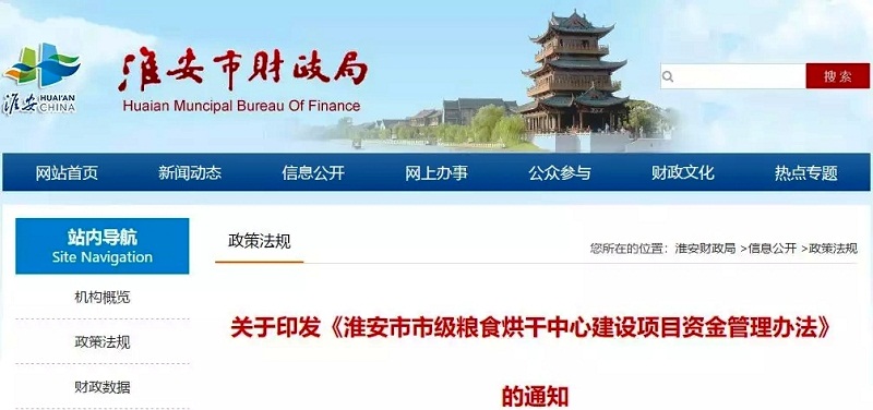 2018年7月2日,淮安市財(cái)政局、市農(nóng)機(jī)局聯(lián)合印發(fā)《淮安市市級(jí)糧食烘干中心建設(shè)項(xiàng)目資金管理辦法》,支持項(xiàng)目資金采取先建后補(bǔ)支持方式,每個(gè)烘干中心補(bǔ)助額不超過10萬元。原則上同一主體已享受過市級(jí)財(cái)政烘干中心建設(shè)項(xiàng)目資金補(bǔ)助的不再支持。