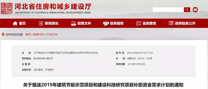 2018年10月24日,河北省住房城鄉建設廳辦公室印發《關于報送2019年建筑節能示范項目和建設科技研究項目補助資金需求計劃的通知》,指出在建筑節能示范項目方面,2019年省級建筑節能專項資金補助項目,原則上暫按《河北省建筑節能資金管理暫行辦法》(冀財建﹝2015﹞88號)、《關于省級建筑節能專項資金使用有關問題的通知》(冀建科﹝2017﹞34號)申報。其中二星級綠色建筑運行標識項目、可再生能源建筑應用示范項目(空氣源熱泵項目)。