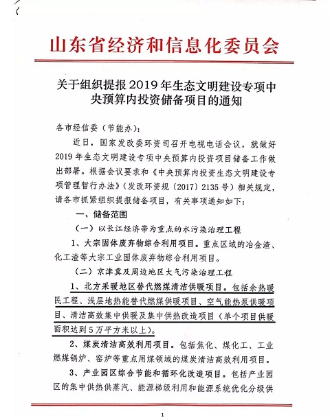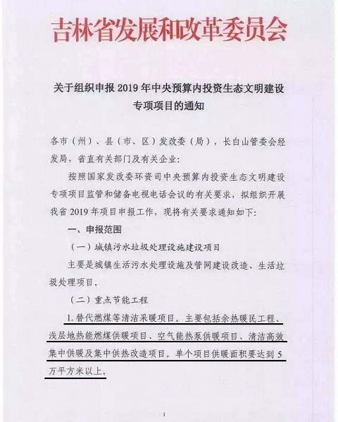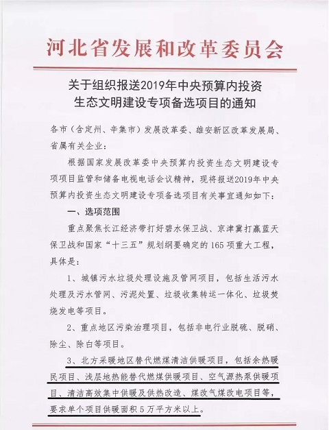 2018年7月31日,河南省發展和改革委員會印發《關于組織申報2019年中央預算內投資生態文明建設專項備選項目的通知》,指出專項備選重點為北方采暖地區替代燃煤清潔供暖項目,主要包括余熱暖民工程、淺層地熱能替代燃煤供暖項目,空氣源熱泵供暖項目,清潔高效集中供暖及集中供熱改造項目,單個項目的供暖面積要達到5萬平方米以上。