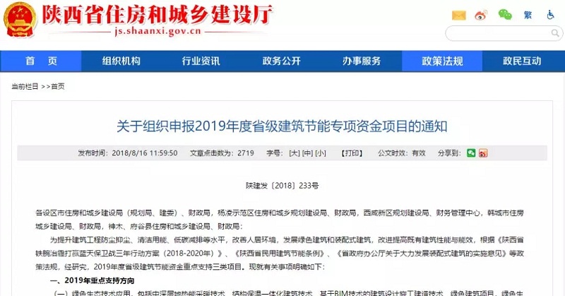 2018年8月15日,陜西省住房和城鄉建設廳、陜西省財政廳印發《關于組織申報2019年度省級建筑節能專項資金項目的通知》,指出2019年度省級建筑節能資金重點支持綠色生態技術應用項目,包括中深層地熱能采暖技術等,綠色生態城區建設試點示范;建筑能效提升,包括農村建筑節能改造技術、農村清潔能源取暖技術、低能耗建筑技術;技術集成創新,上述兩個類別項目實施中,聚焦新技術新產品推廣所面臨的問題,同步開展工程應用研究的項目。申請“先建后補、以獎代補”等方式的綠色建筑項目、省級建筑節能資金支持項目,應嚴格按照經審查的工程方案、申報方案進行施工并完成全部技術內容且竣工驗收合格。