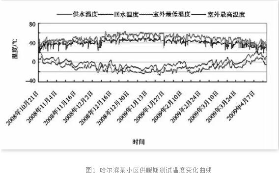 然而,通過對供暖系統的實際運行調查,目前北方地區大多數城市集中供熱系統運行參數,就是在最冷月運行參數也遠遠小于設計工況。對北方幾十個城市調查結果是:二次網供水溫度約在47℃~63℃,回水溫度約在40℃~50℃,運行溫差約為7.8℃~14.7℃,溫差均小于設計溫差20℃。圖1是哈爾濱某小區測試整個供暖季溫度變化曲線,供暖初期供熱溫度低于40℃,最冷天氣供熱溫度為60℃。
