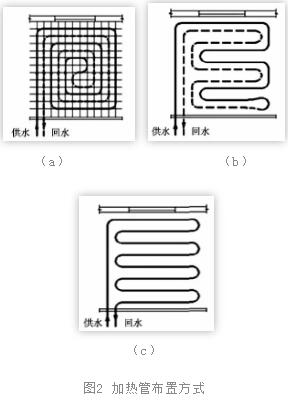 選用末端設備時應考慮房間功能、生活習慣和運行方式,從舒適性和經濟性方面考慮,選擇適合住戶需求的地板輻射供暖、風機盤管供暖、散熱器供暖形式。新建與既有建筑增設供暖設施要加以區別:新建住宅可完全按設計規范規定進行,而既有建筑增設供暖設施要考慮住戶的具體要求,可進行局部主要房間加裝供暖設施。既有建筑增設地板輻射供暖時應考慮荷載,盡量采用干式地板供暖,并考慮局部供暖和家具擺放遮擋。地面飾面層應采用熱阻小的材料。各環路長度應盡可能一致,并加設調節和環路關斷閥門。加熱管布置方式可采用圖2的形式。