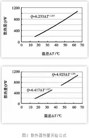 風機盤管冷暖兩用,供水溫度可降低,用于住宅供暖時宜立式安裝,宜靠外窗設置。散熱器用于空氣源熱泵供暖系統,熱媒溫度可降低與熱水供應溫度55℃一致。其散熱量計算完全可按各類散熱器給出的實驗公式,代入ΔT℃進行計算即可。圖3是對同一組散熱器分別對溫差ΔT=15℃~65℃進行分段實驗和連續實驗的結果,低溫工況的散熱量可視為ΔT=40℃~65℃試驗曲線的延長線。