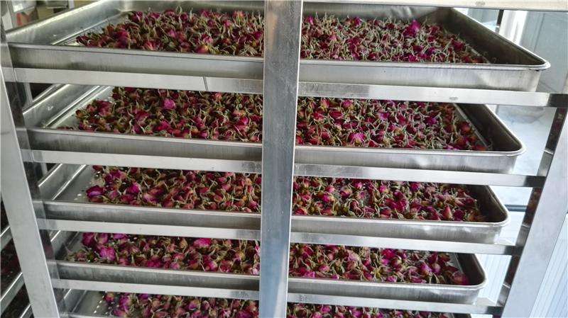 采用空氣源熱泵烘干機之后,完全可以杜絕SO2問題,。相比傳統工藝還不受天氣的制約,還大大的提高了生產效率。此外,空氣源熱泵烘干機烘干玫瑰花可進行大批量連續生產,并最大限度的保留產品的營養成份及顏色等。也可根據玫瑰花特點,采用不同的工藝流程及添加配套必要的輔助設備。烘干產量多,烘干速度快,干品藥效高,省燃料,熱效率高,干品顏色好。