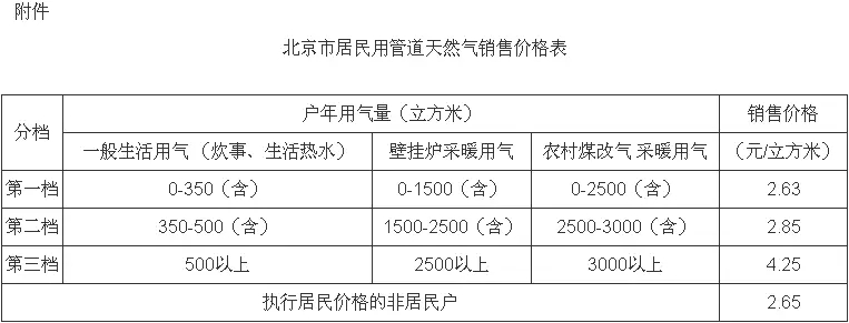 注:執行居民氣價的非居民用戶范圍(不包括集中供熱用氣)為學校教學和學生生活用氣,向老年人、殘疾人、孤殘兒童開展養護、托管、康復服務的社會福利機構用氣,城鄉社區居委會公益性服務設施用氣。具體學校以市教育部門按照相關規定認定為準,社會福利機構和城鄉居委會公益性服務設施以市民政部門按相關規定認定為準。