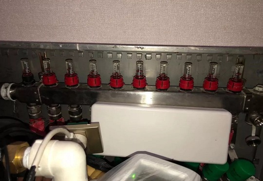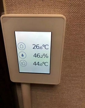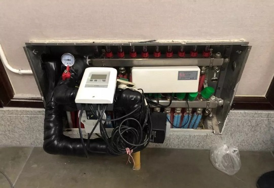 在分集水器前端加裝了混水中心,全自動化調節地暖供水溫度,實現氣候補償技術。室內裝有中央控制器,溫濕度露點控制面板,夏季地板可制冷,處理圍護結構負荷,實現露點保護技術。室外部分PUN601離心泵,影響混水閥出水的準確度,更換為PUN200離心泵泵,降低外置水泵對混水閥的影響,同時降低了運行能耗。二次側只用一臺15-8的高效泵負責末端循環,調試時分集水器流量計顯示3L/min說明地暖側水流量充足。