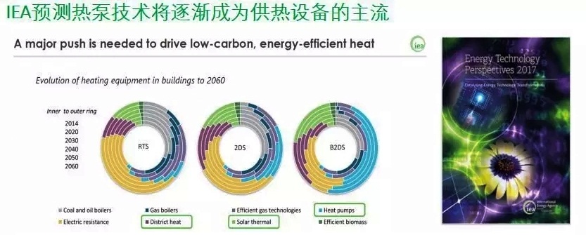 如上圖所示,在國際能源署2017能源技術(shù)展望中指出,自2014年至2060年,隨著年份的不斷推移,空氣源熱泵供熱等(Heat pumps)、太陽能(Solar thermal)、燃?xì)獗趻鞝t(Gas boilers)等主要供熱產(chǎn)品所占比重也將會發(fā)生改變,隨著空氣源熱泵供熱等應(yīng)用的逐年增長,在2030年將全球氣候升溫控制在2℃以內(nèi)的總體目標(biāo)就會得到逐步實現(xiàn),甚至超越目標(biāo)。