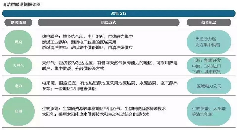 在操作層面,《規劃》已經明確,參考城市和農村供暖面積增速,按照整體供暖面積年均增速6%計算,預測到2021年,北方地區供暖面積約為276億立方米。按照清潔供暖面積不低于70%,具體目標是:清潔燃煤集中供暖、天然氣供暖、生物質能清潔供暖、電供暖(含空氣源熱泵等熱泵類)、地熱供暖分別達到110億、40億、21億、15億、10億平方米。
