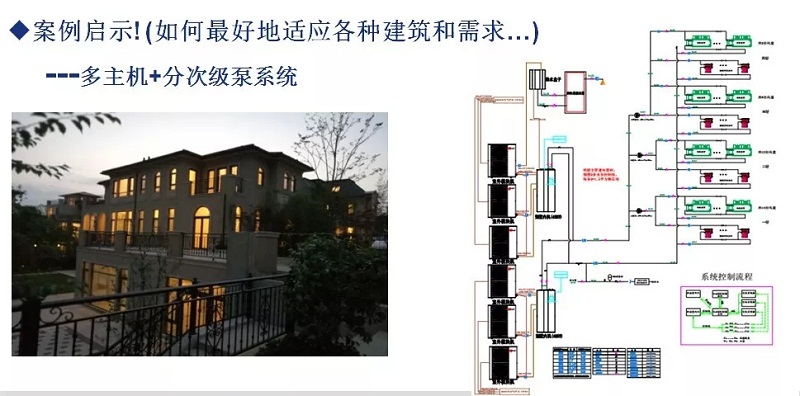 下圖是我們?cè)诤贾莸囊粋(gè)大別墅案例,就采用了多主機(jī)+分次級(jí)泵系統(tǒng),空氣源熱泵可以和末端直接通迅對(duì)接同時(shí)控制對(duì)應(yīng)能力的壓縮機(jī)和次級(jí)泵的輸出,這里面運(yùn)用了很多感應(yīng)的技術(shù),用戶對(duì)現(xiàn)在這個(gè)系統(tǒng)總體上還是非常滿意的,特別是我們解決了極低負(fù)荷下(如只有兩人在家開一個(gè)房間的制冷)時(shí),水泵輸送功耗的問題,在大別墅里10%以下的低負(fù)荷運(yùn)行占據(jù)90%以上的時(shí)間比,因此,低負(fù)荷下的能效比對(duì)用戶而言就非常關(guān)鍵!目前我們的技術(shù)平臺(tái)完全支持個(gè)性化的要求,這是我們智能熱泵能做到的。