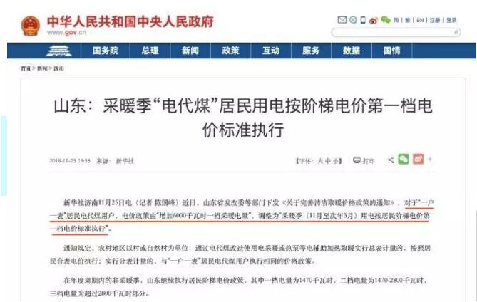 山東發(fā)改委發(fā)布了《關(guān)于完善清潔取暖價格政策的通知》,明確“一戶一表”居民電代煤用戶,采暖季(11月至次年3月)用電按居民階梯電價第一檔電價標(biāo)準(zhǔn)執(zhí)行。工商業(yè)的電代煤項(xiàng)目、居民住宅小區(qū)內(nèi)采用空氣源熱泵電鍋爐等電采暖電輔助加熱取暖項(xiàng)目,按照“清潔取暖用電市場化競價采購”政策執(zhí)行。