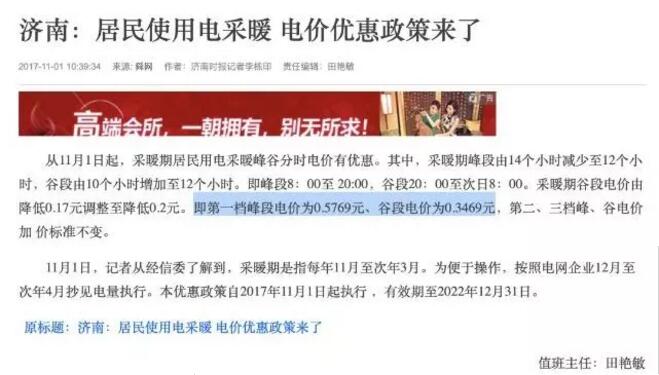 陜西發(fā)布了《陜西省冬季清潔取暖實(shí)施方案(2017-2021年)》,明確:將每天24小時劃分為高峰、低谷兩個時段,用電高峰時段為每天8時至晚上10時,用電低谷時段為每天晚上10時至次日8時。峰段第一檔為0.5483元;谷段第一檔為0.2983元。